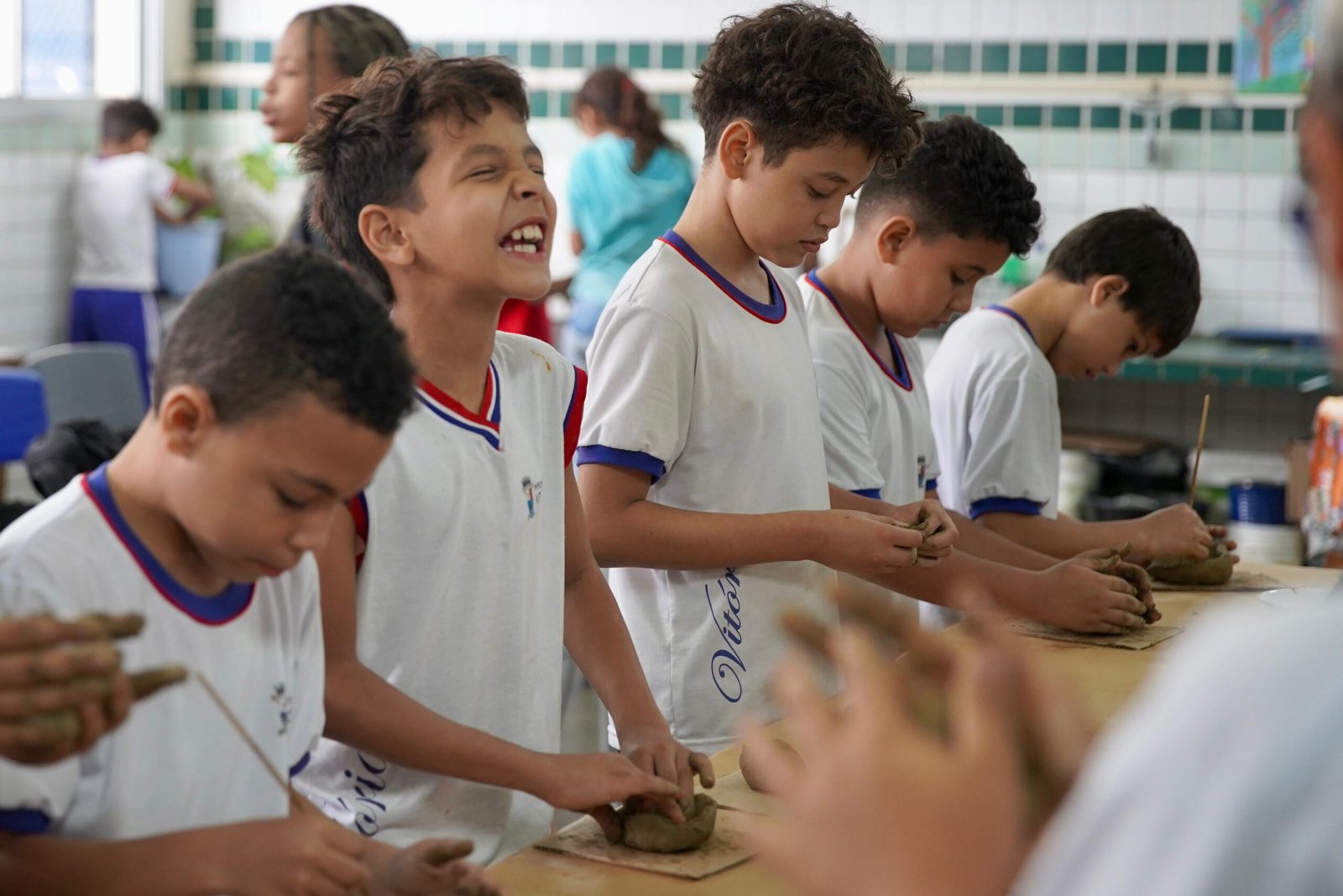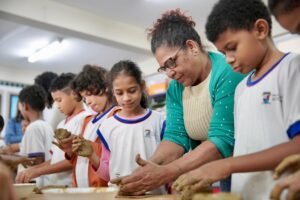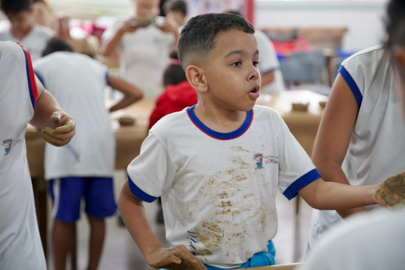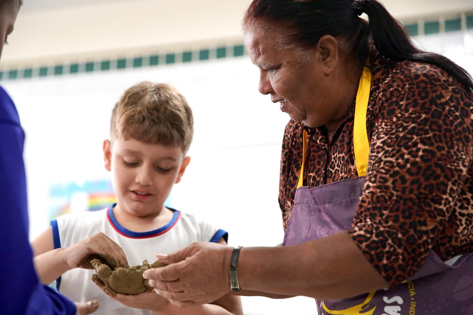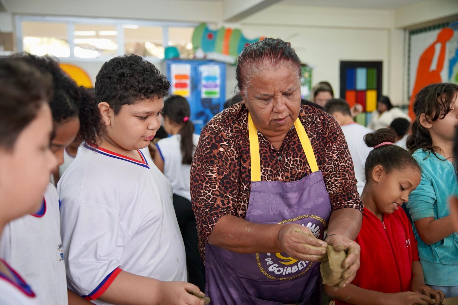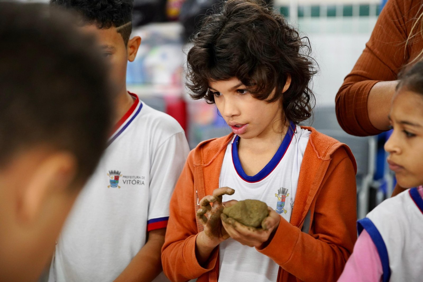 Como a EMEF Juscelino K. de Oliveira fica no bairro de Goiabeiras, muitas crianças já conheciam o galpão ou o ofício das paneleiras da região. Então foi, praticamente, uma oficina “avançada”, com dúvidas e comentários, digamos assim, mais aprofundados no tema. O que não diminuiu a empolgação, de forma alguma, com o contato direto com o barro.