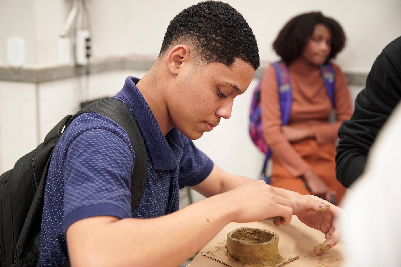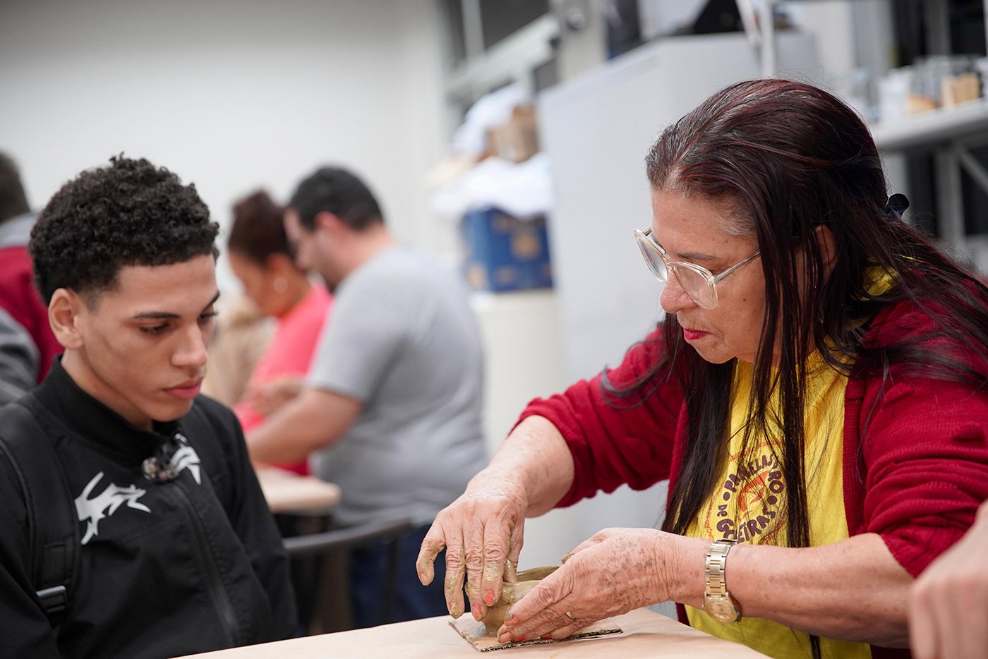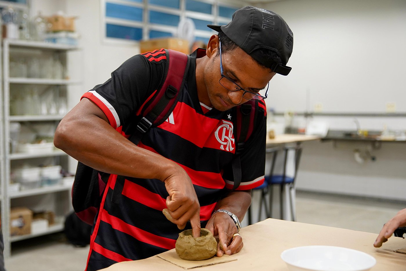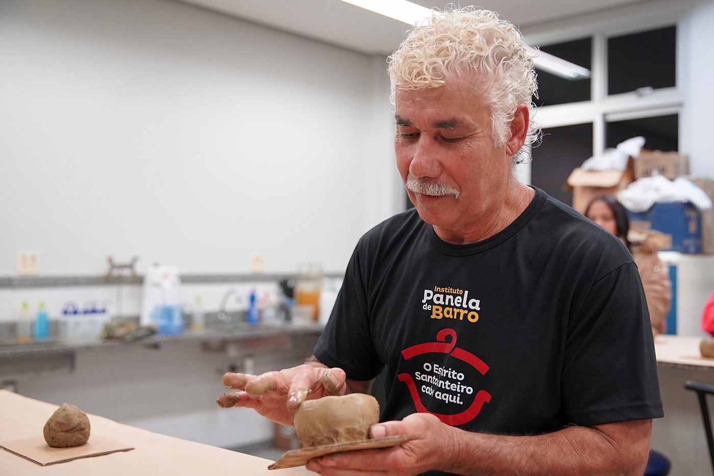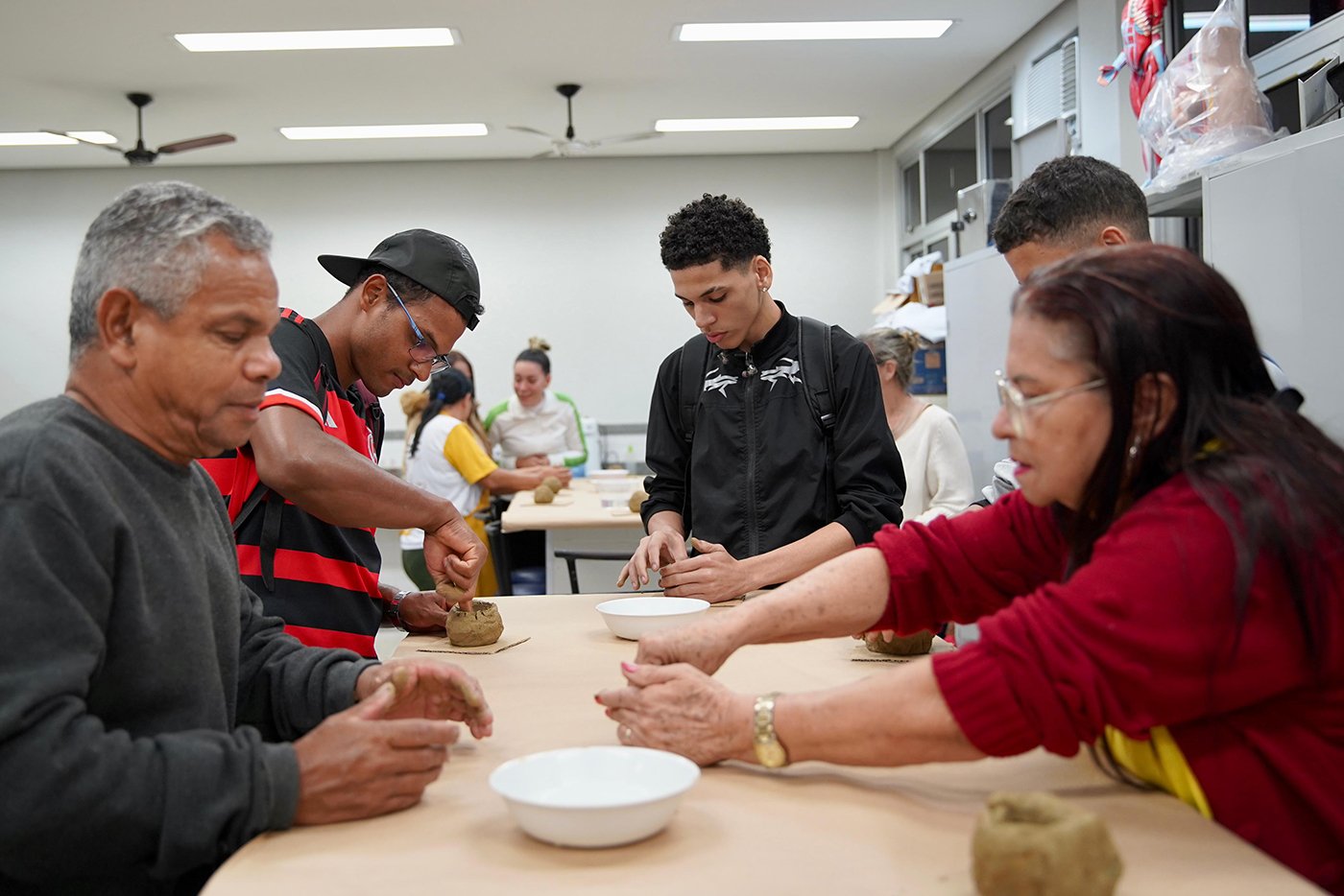 Turma da Educação de Jovens e Adultos (EJA), sob a orientação das paneleiras Bernardete da Victória, Berenícia Correa Nascimento e do artesão Laílson Gomes Ferreira. A programação é a mesma e faz sucesso em qualquer idade: assistir ao filme “É da Mão de Quem? – Paneleiras”, aprender com o trio detalhes do processo da fabricação das panelas de barro de Goiabeiras e modelar as próprias panelinhas no barro. A paneleira Jamilda Bento também estava presente e contou à turma algumas de suas histórias.