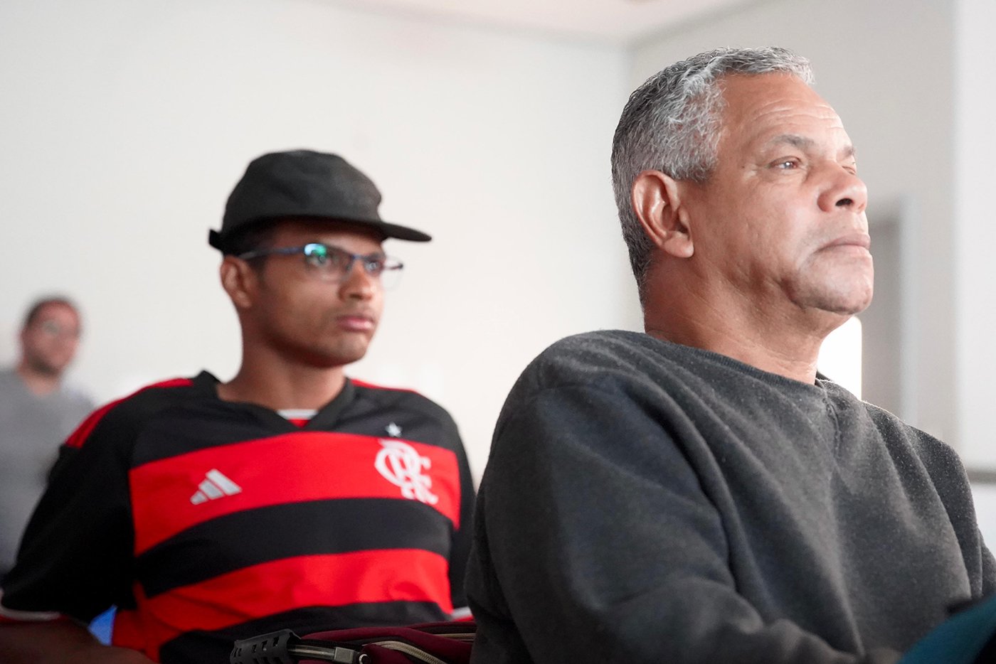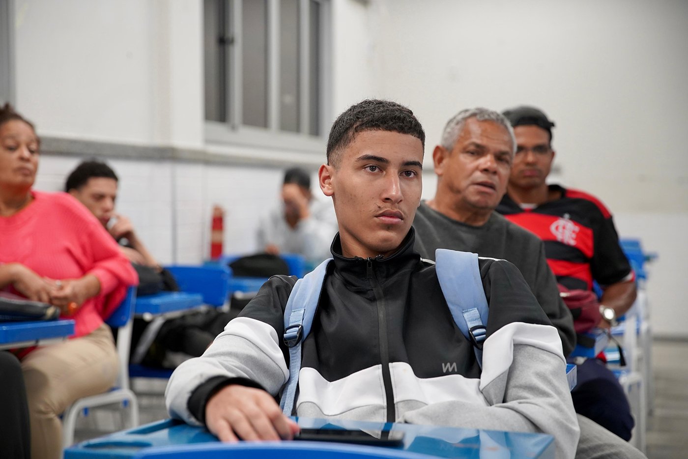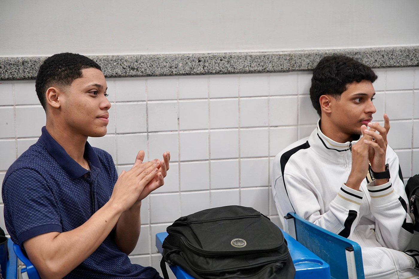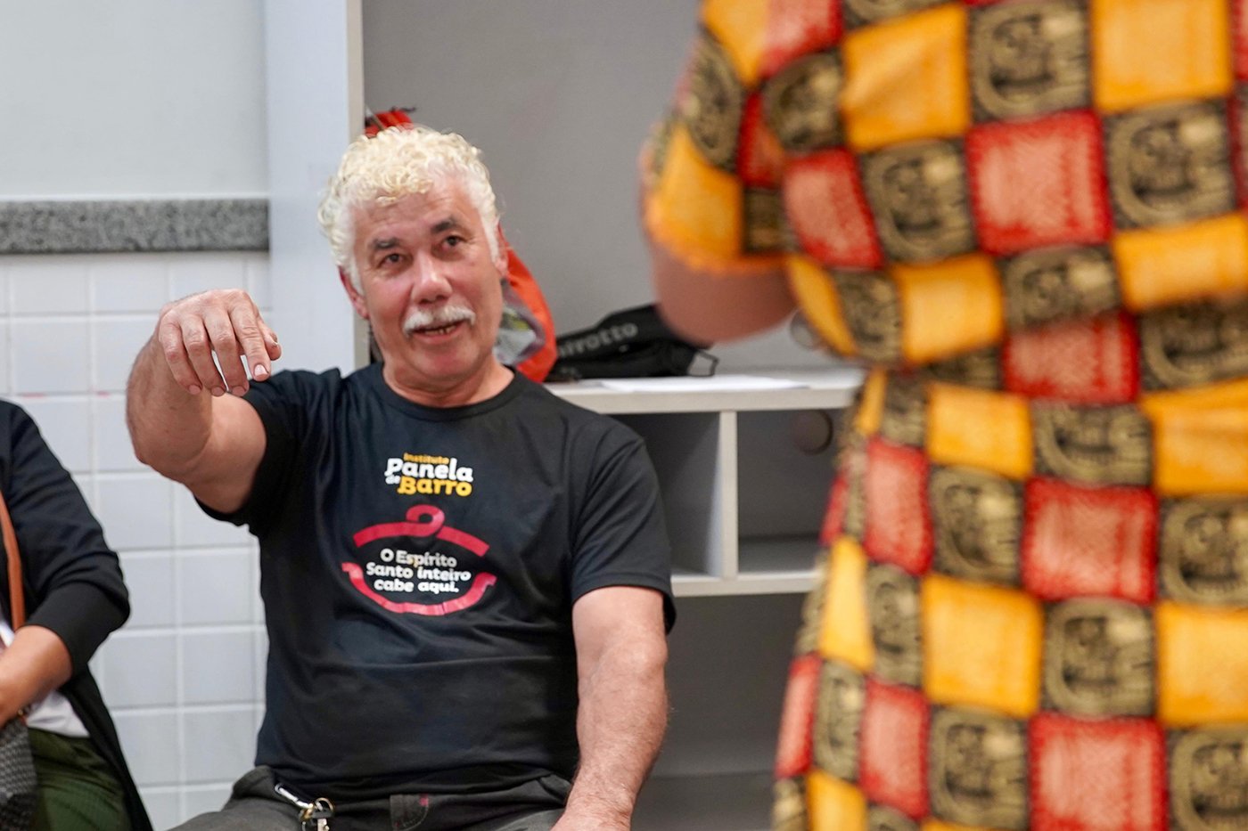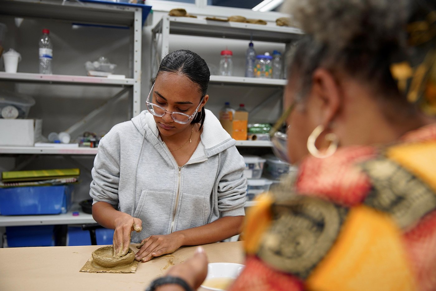 Turma da Educação de Jovens e Adultos (EJA), sob a orientação das paneleiras Bernardete da Victória, Berenícia Correa Nascimento e do artesão Laílson Gomes Ferreira. A programação é a mesma e faz sucesso em qualquer idade: assistir ao filme “É da Mão de Quem? – Paneleiras”, aprender com o trio detalhes do processo da fabricação das panelas de barro de Goiabeiras e modelar as próprias panelinhas no barro. A paneleira Jamilda Bento também estava presente e contou à turma algumas de suas histórias.