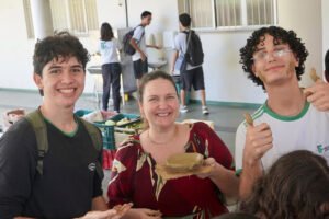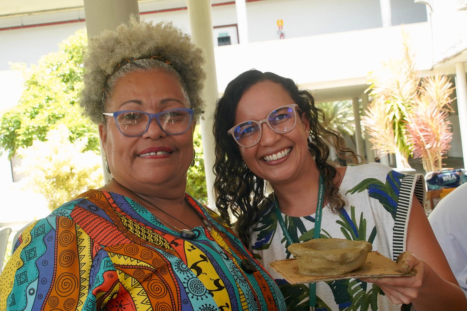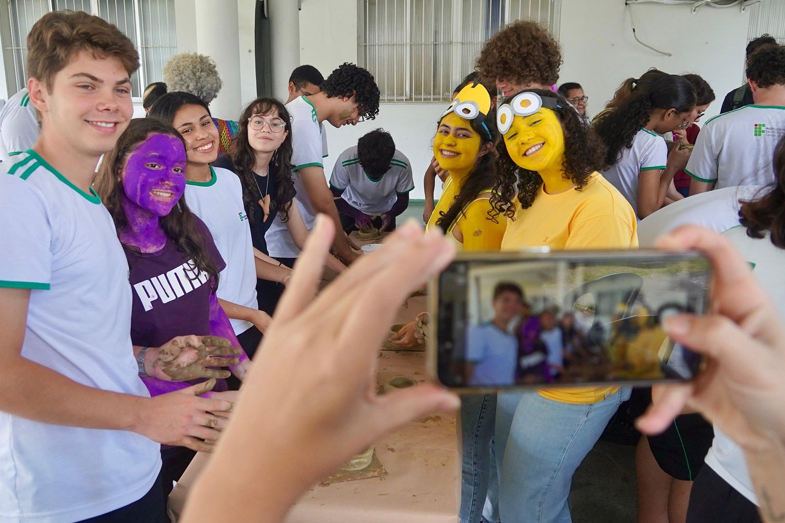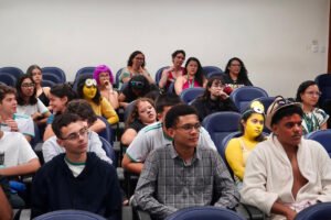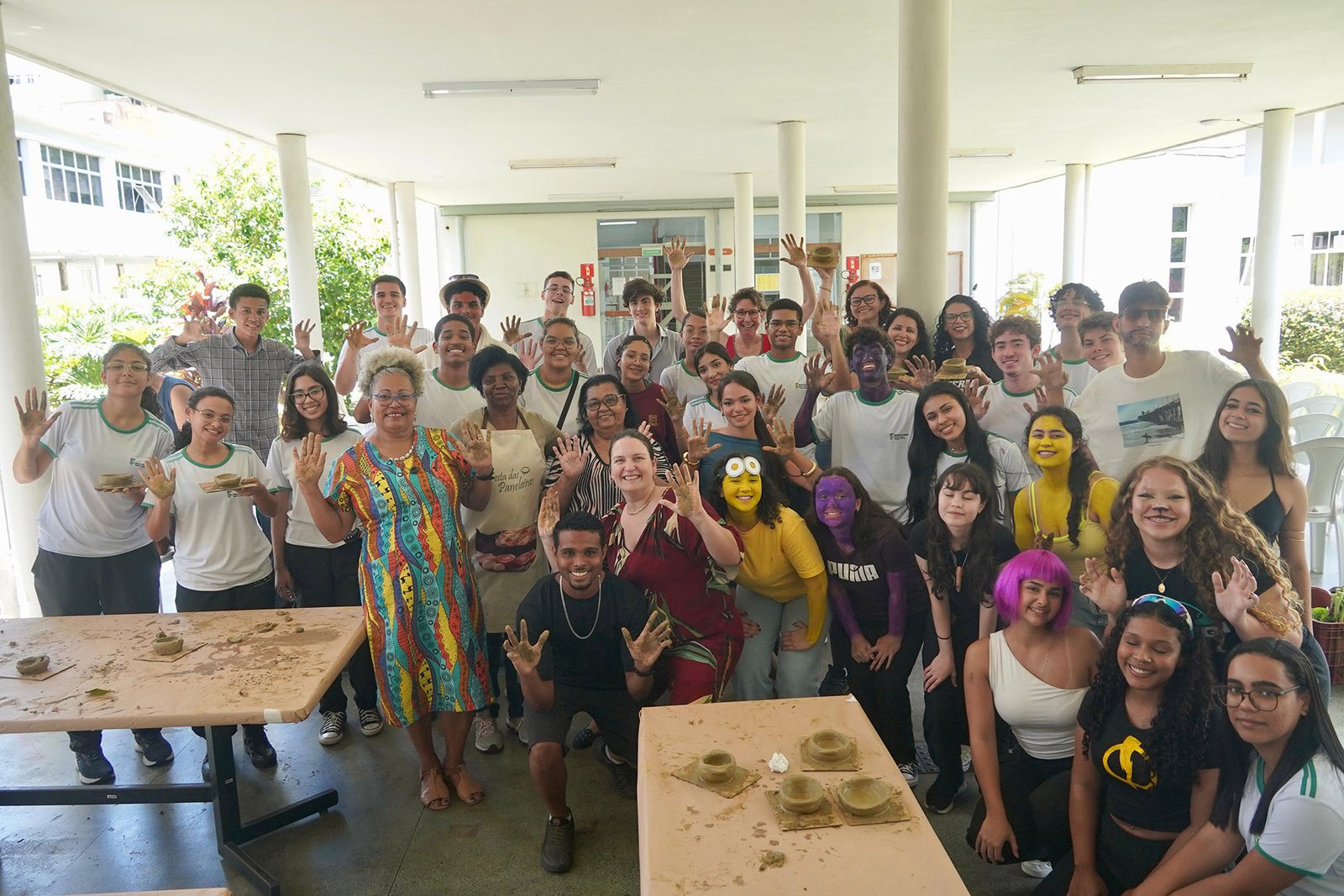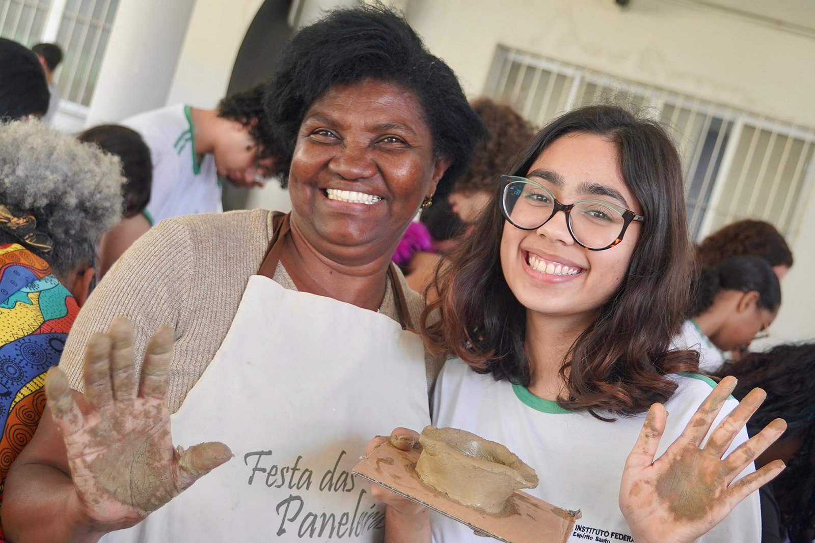 Primeira oficina do dia no Instituto Federal do Espírito Santo, o IFES Vitória. Cerca de 40 estudantes, alguns fantasiados para comemorar a semana do halloween, ouviram e aprenderam com as paneleiras detalhes do processo da fabricação das panelas de barro de Goiabeiras e da vida das mulheres e homens que vivem do ofício. Marly Barbosa, Lucilina Lucidato de Carvalho e Jamilda Bento, que além de paneleira  também é contadora e “cantadora” de histórias, foram as oficineiras da turma do segundo ano de edificações.