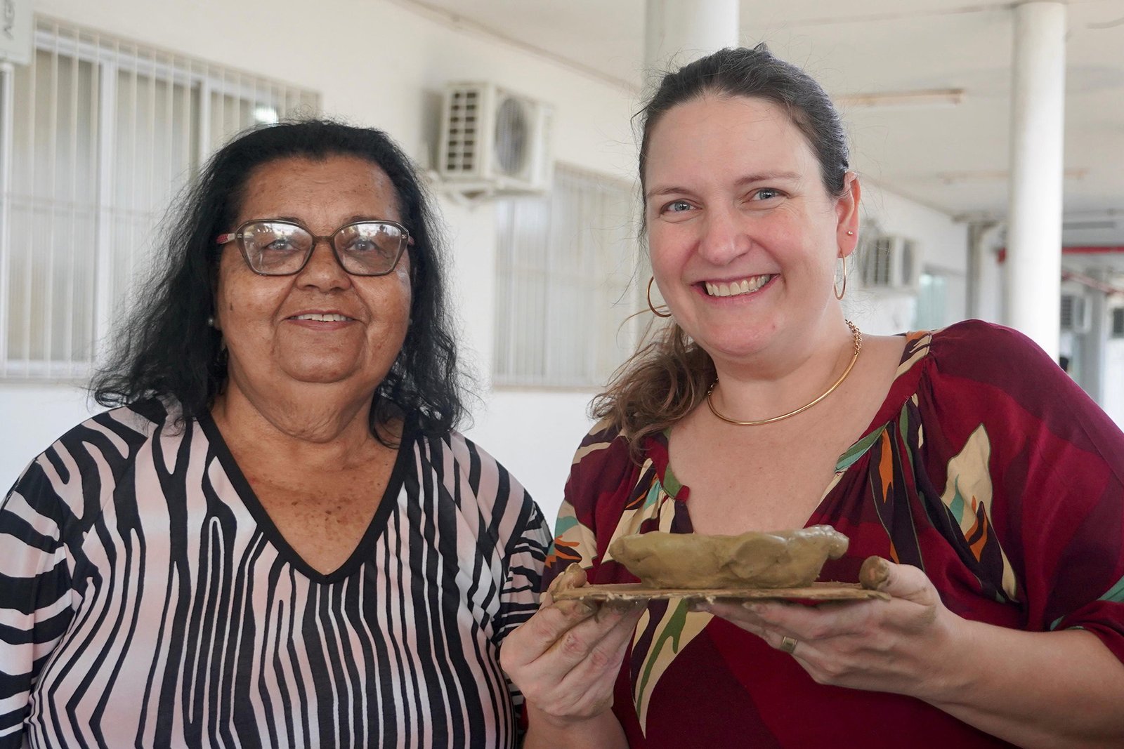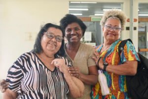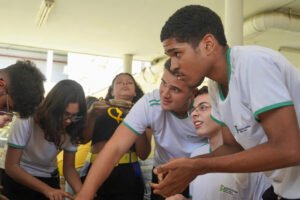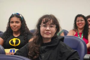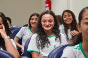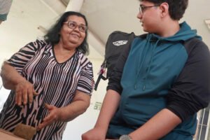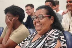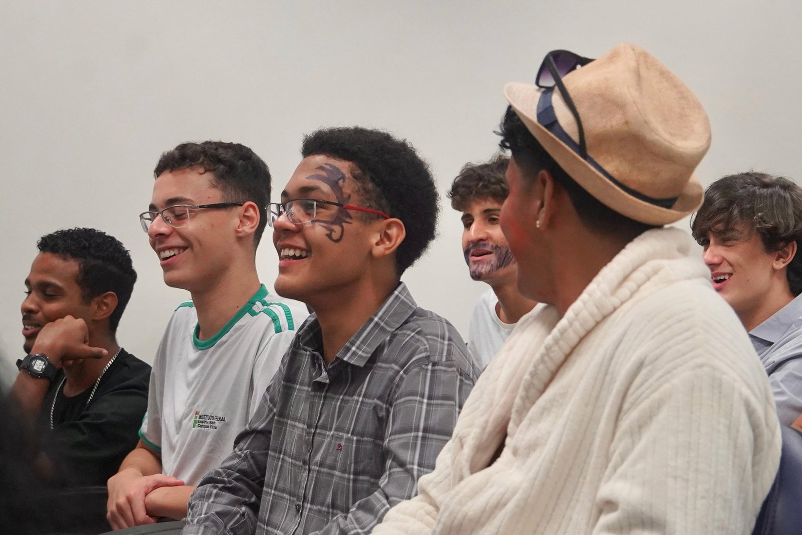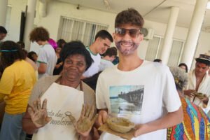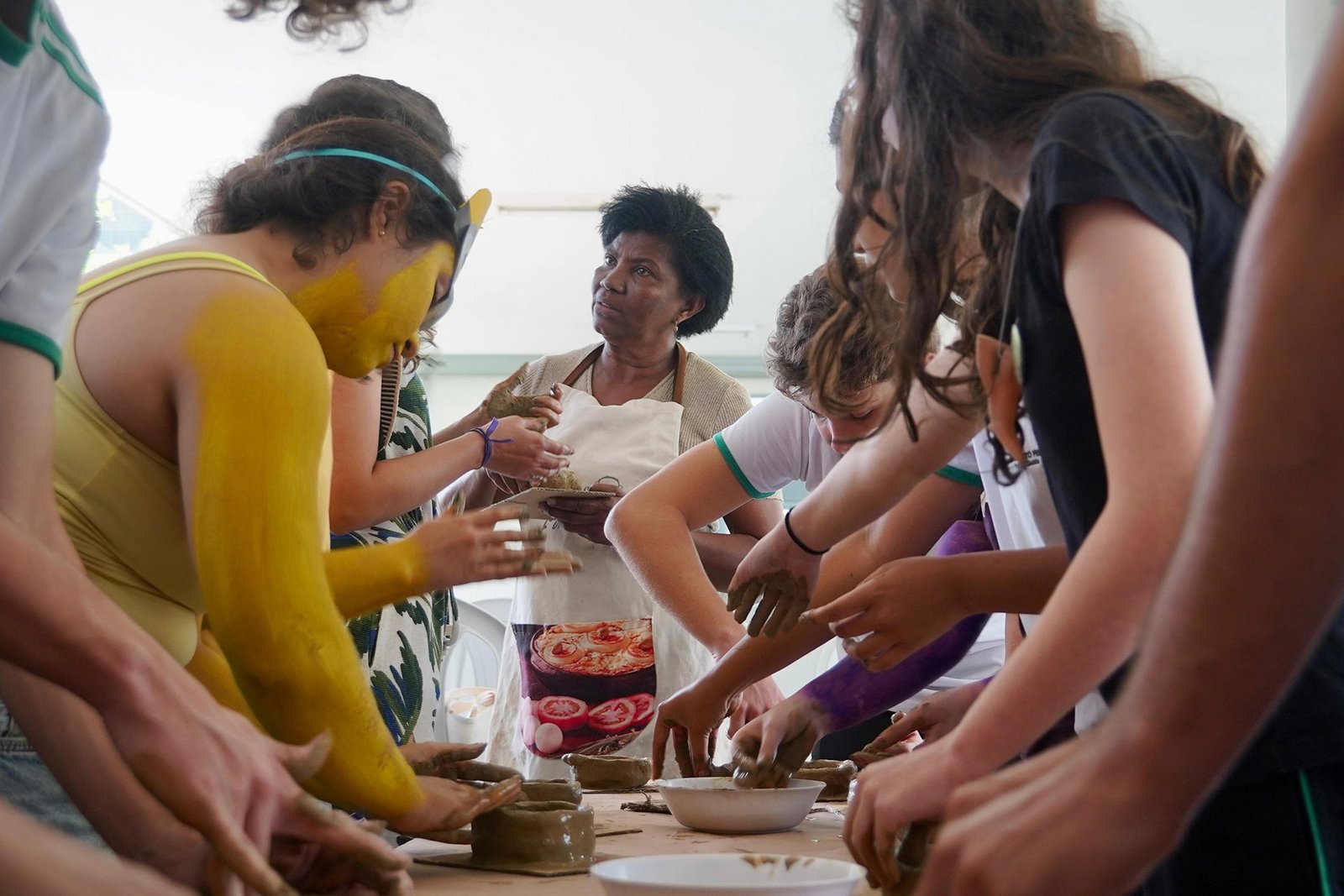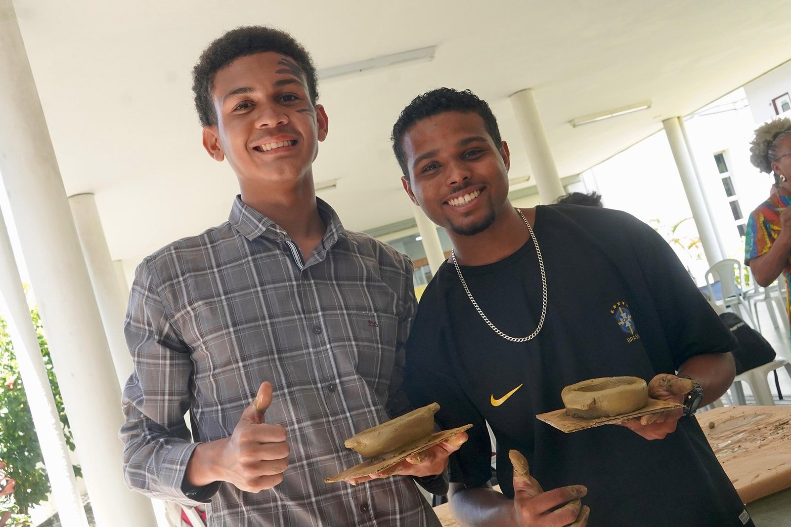 Primeira oficina do dia no Instituto Federal do Espírito Santo, o IFES Vitória. Cerca de 40 estudantes, alguns fantasiados para comemorar a semana do halloween, ouviram e aprenderam com as paneleiras detalhes do processo da fabricação das panelas de barro de Goiabeiras e da vida das mulheres e homens que vivem do ofício. Marly Barbosa, Lucilina Lucidato de Carvalho e Jamilda Bento, que além de paneleira  também é contadora e “cantadora” de histórias, foram as oficineiras da turma do segundo ano de edificações.