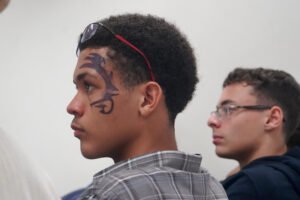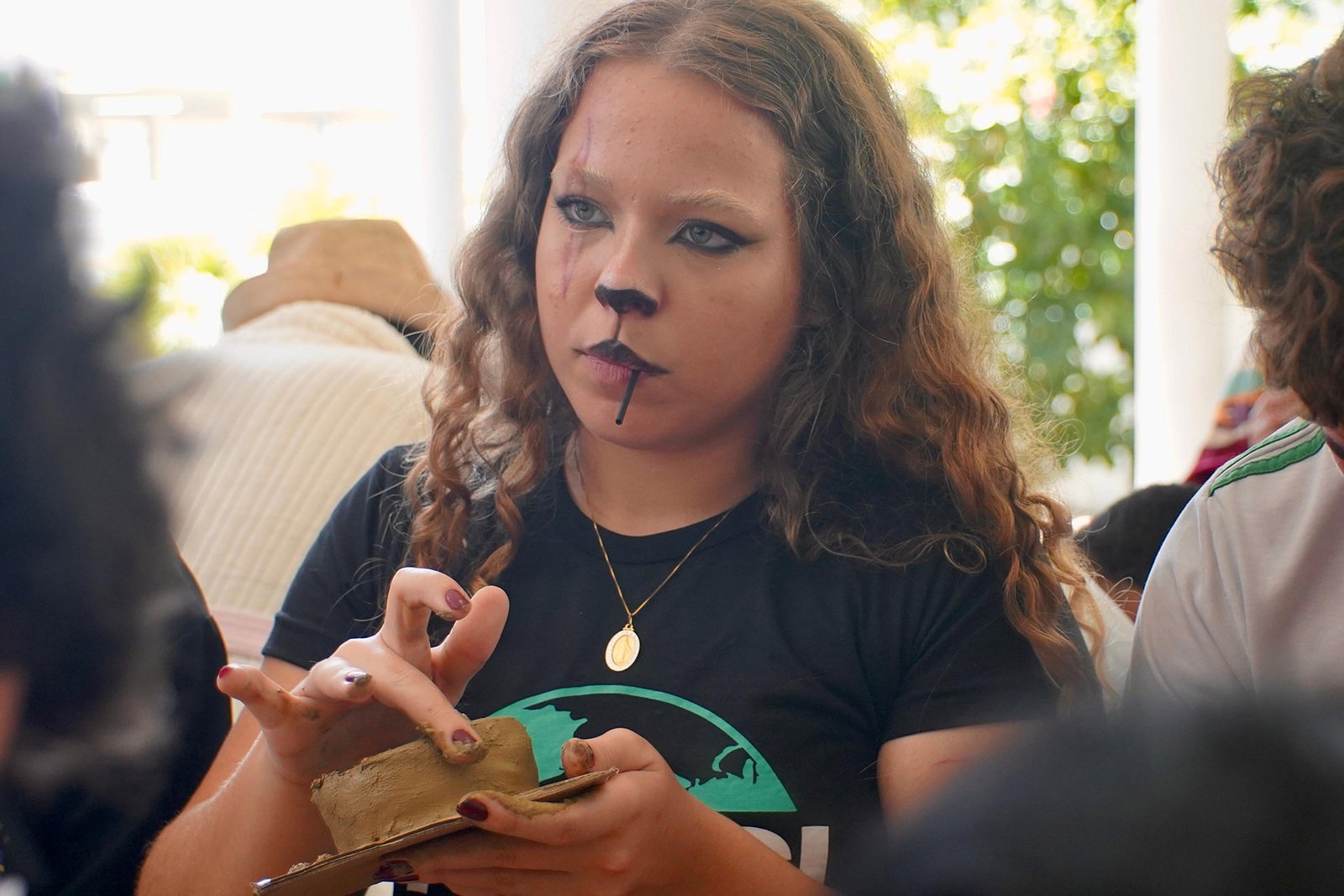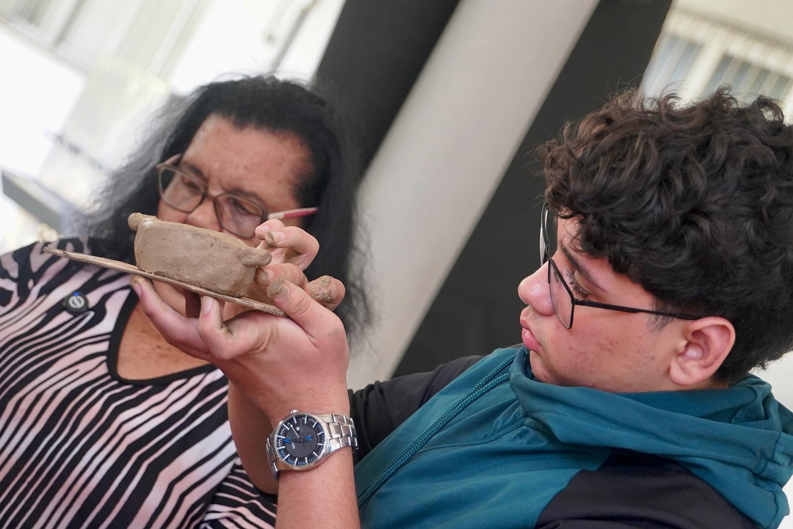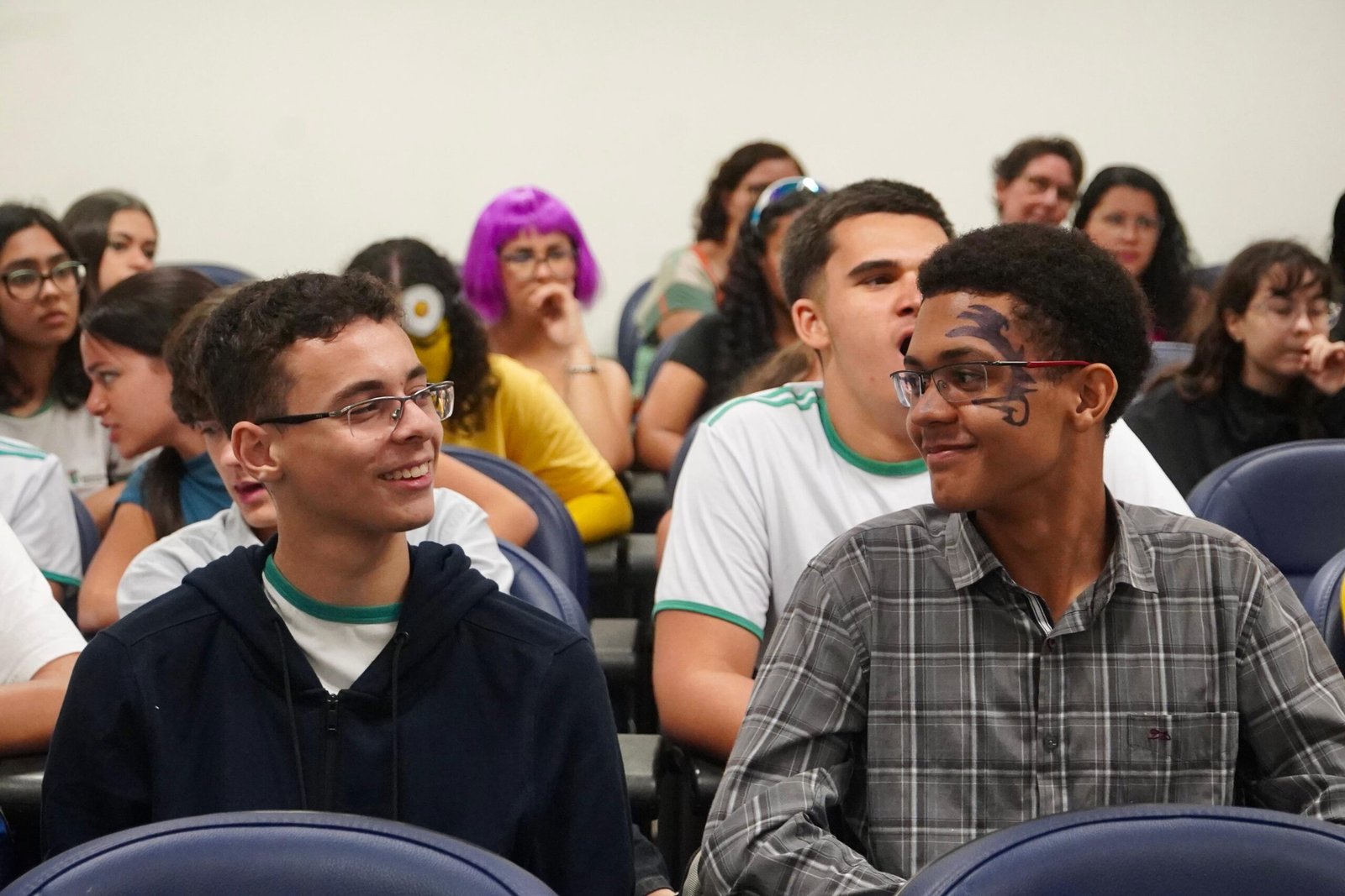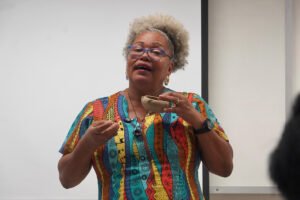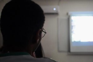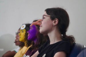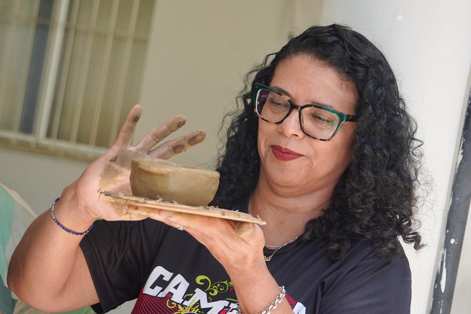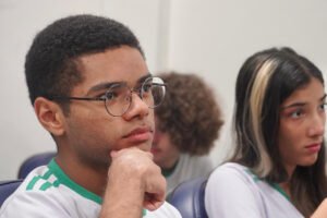 Primeira oficina do dia no Instituto Federal do Espírito Santo, o IFES Vitória. Cerca de 40 estudantes, alguns fantasiados para comemorar a semana do halloween, ouviram e aprenderam com as paneleiras detalhes do processo da fabricação das panelas de barro de Goiabeiras e da vida das mulheres e homens que vivem do ofício. Marly Barbosa, Lucilina Lucidato de Carvalho e Jamilda Bento, que além de paneleira  também é contadora e “cantadora” de histórias, foram as oficineiras da turma do segundo ano de edificações.