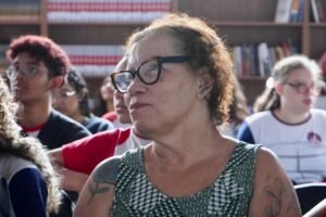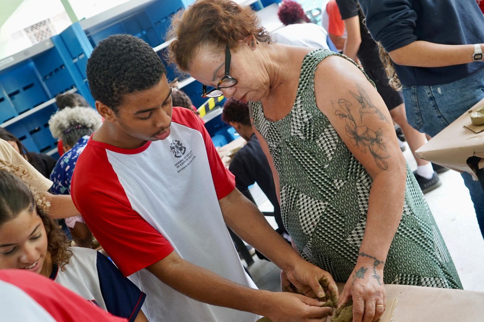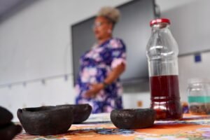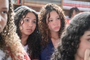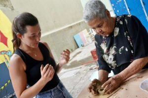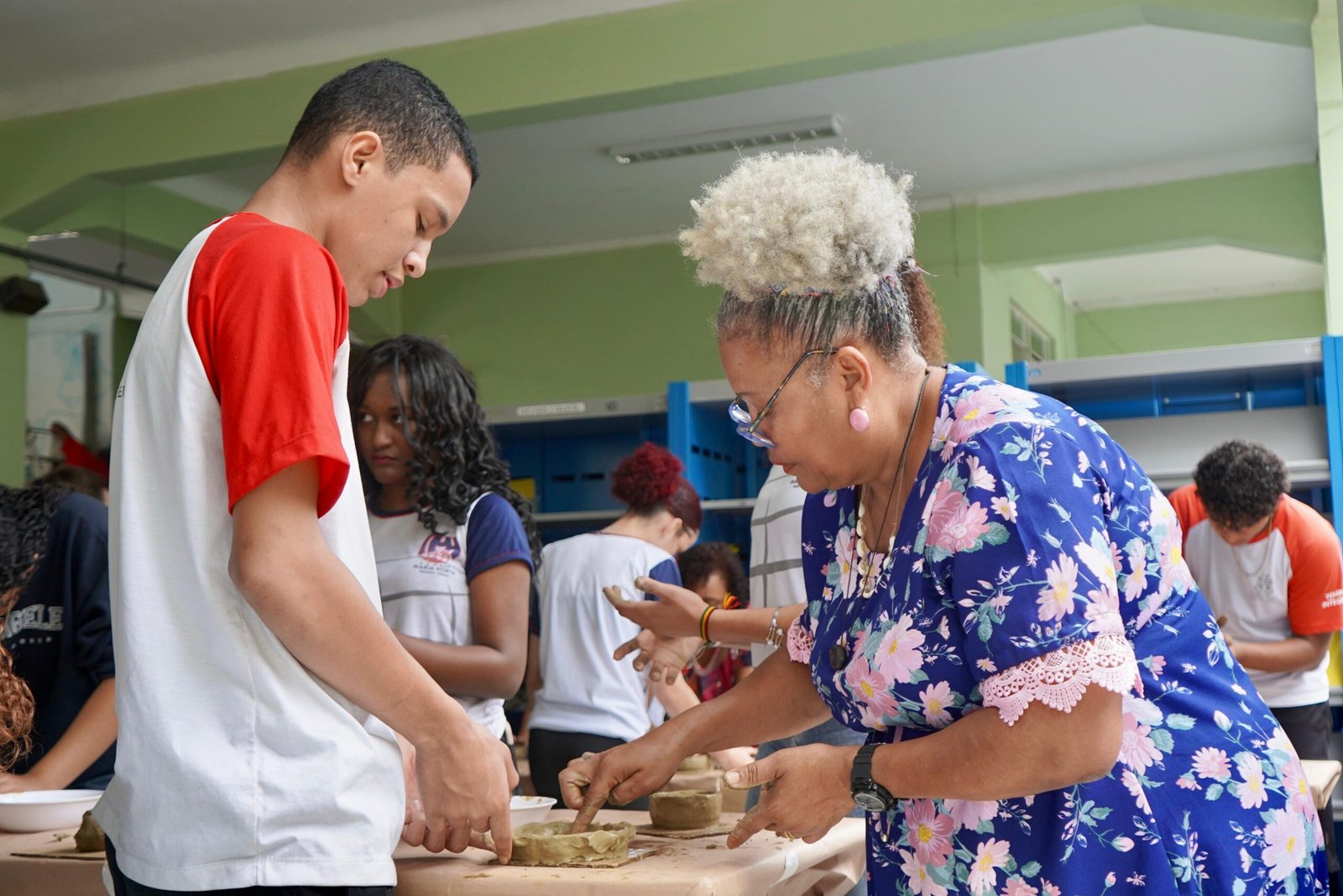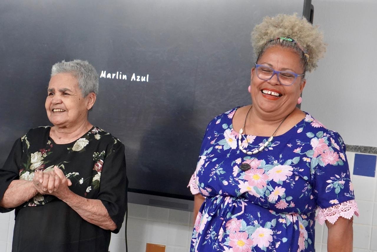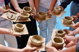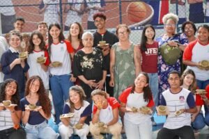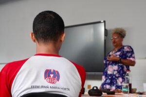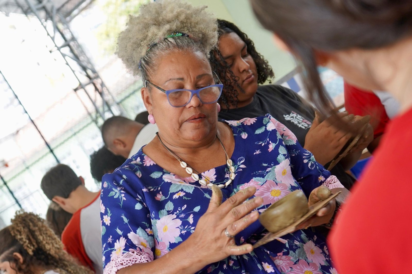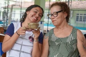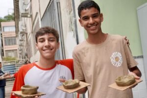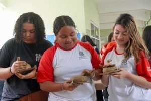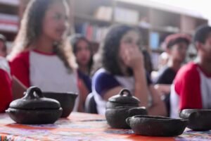 Pela manhã, cerca de 45 estudantes das turmas do 1o ano participaram das atividades com as paneleiras Jennette Alves Rodrigues, Sonia dos Santos Conceição Ferreira e Jamilda Bento, esta última também contadora de histórias. Elas explicaram o processo de fabricação das panelas e contaram histórias sobre como aprenderam o ofício, na maioria das vezes, com suas mães e avós, ainda meninas. Depois a turma assistiu ao curta “É da Mão de Quem? – Paneleiras”, primeiro episódio da série Griôs de Goiabeiras (que você pode assistir aqui), e, para finalizar, seguiram para a modelagem de suas próprias panelinhas.