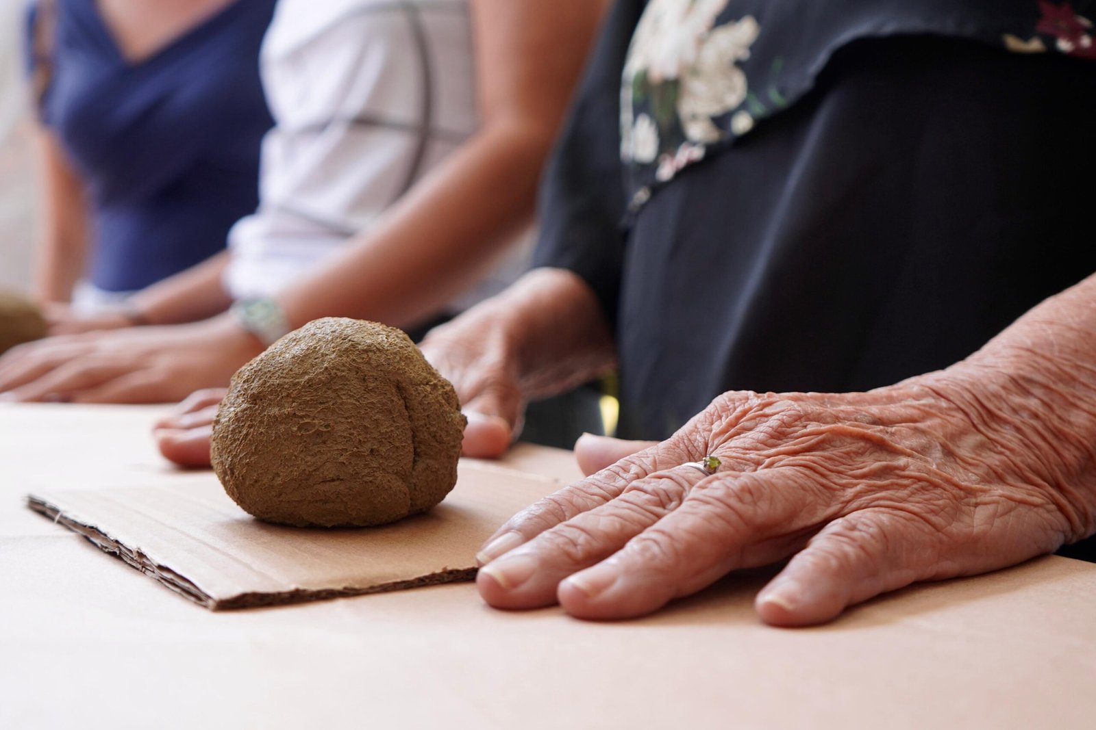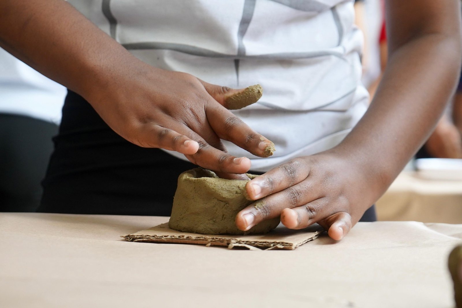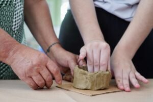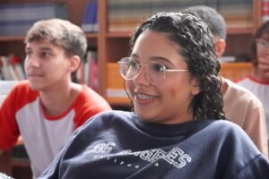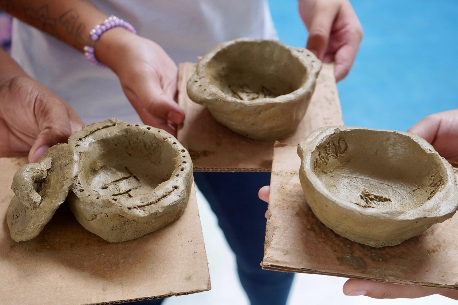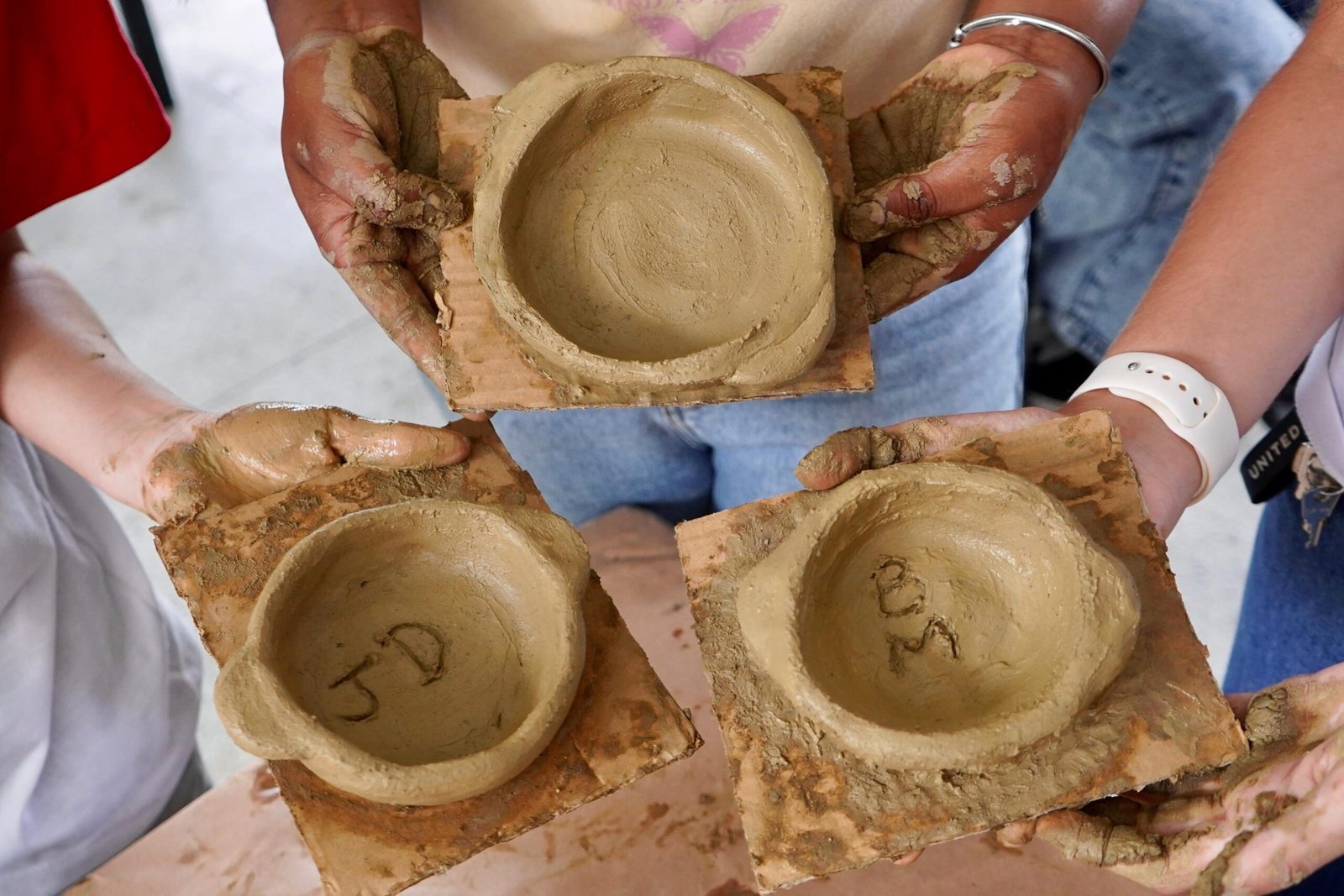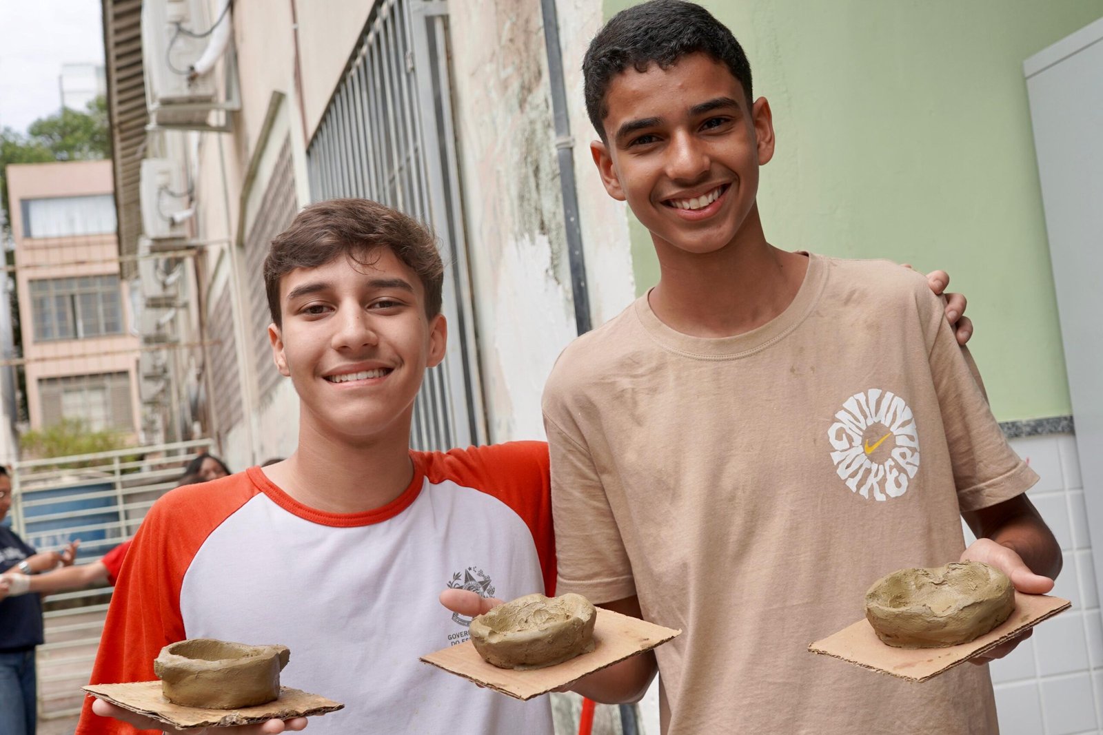 Pela manhã, cerca de 45 estudantes das turmas do 1o ano participaram das atividades com as paneleiras Jennette Alves Rodrigues, Sonia dos Santos Conceição Ferreira e Jamilda Bento, esta última também contadora de histórias. Elas explicaram o processo de fabricação das panelas e contaram histórias sobre como aprenderam o ofício, na maioria das vezes, com suas mães e avós, ainda meninas. Depois a turma assistiu ao curta “É da Mão de Quem? – Paneleiras”, primeiro episódio da série Griôs de Goiabeiras (que você pode assistir aqui), e, para finalizar, seguiram para a modelagem de suas próprias panelinhas.
