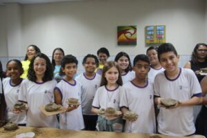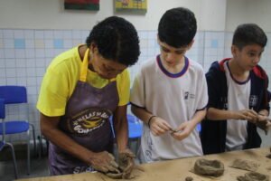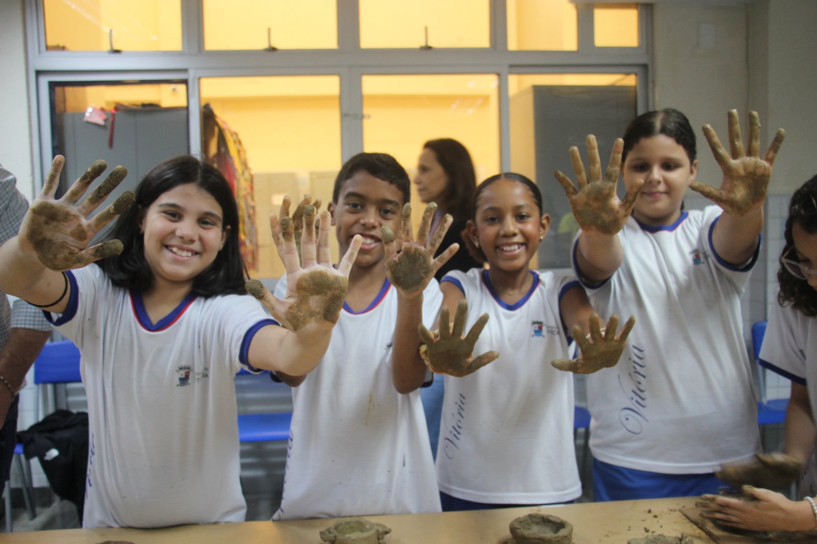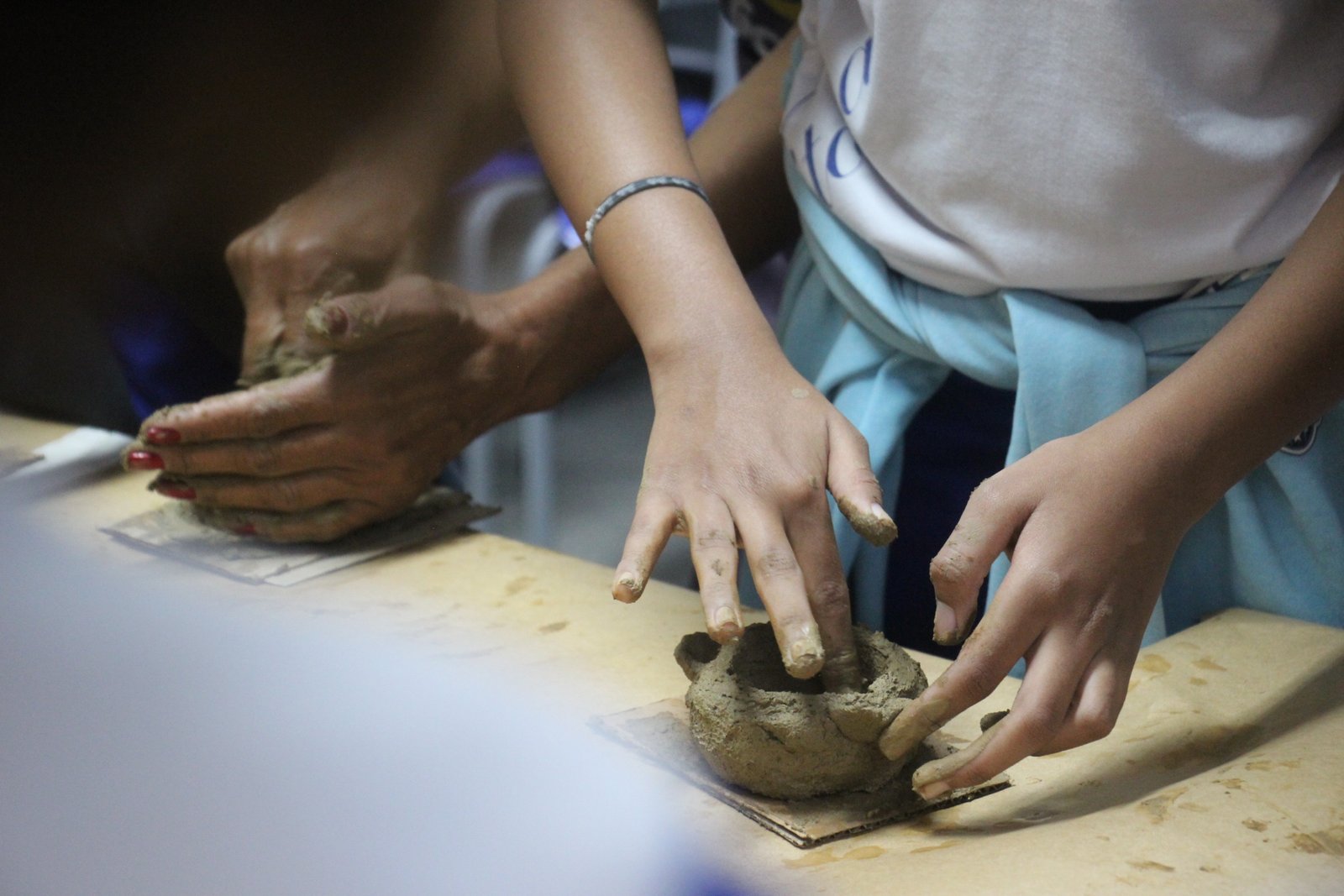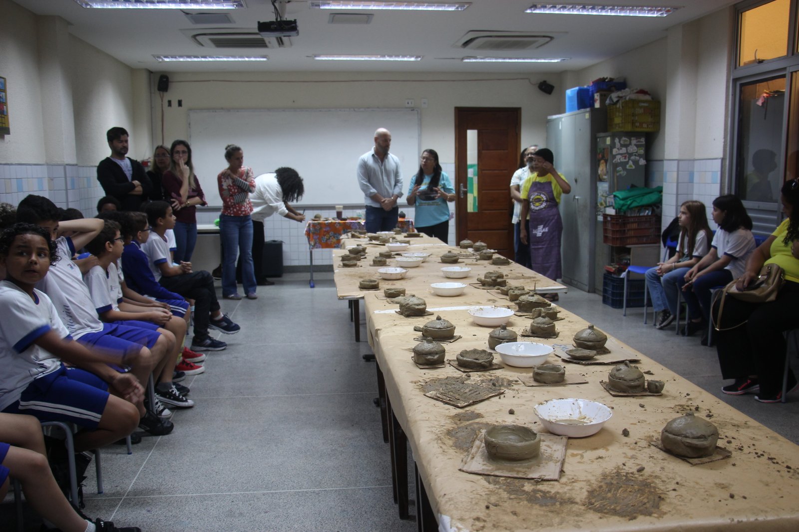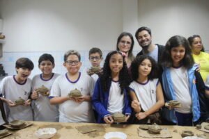 Foi assim, cantarolando a música das paneleiras, que o terceiro ano da EMEF Álvaro de Castro Mattos modelou suas panelinhas durante a terceira oficina do projeto Memória do Barro – Paneleiras, hoje (26/06) pela manhã. Quem comandou a turma foram as paneleiras Rosineia Alvarenga Siqueira, a Rosi (@rosineaalvarengade ), Lucineia de Jesus, a Neia (@paneladebarrodaneia ), e Berenicia Correa Nascimento (@berenicia8 ). O grupo teve a companhia de alguns professores da escola, que vieram dar uma espiadinha.
