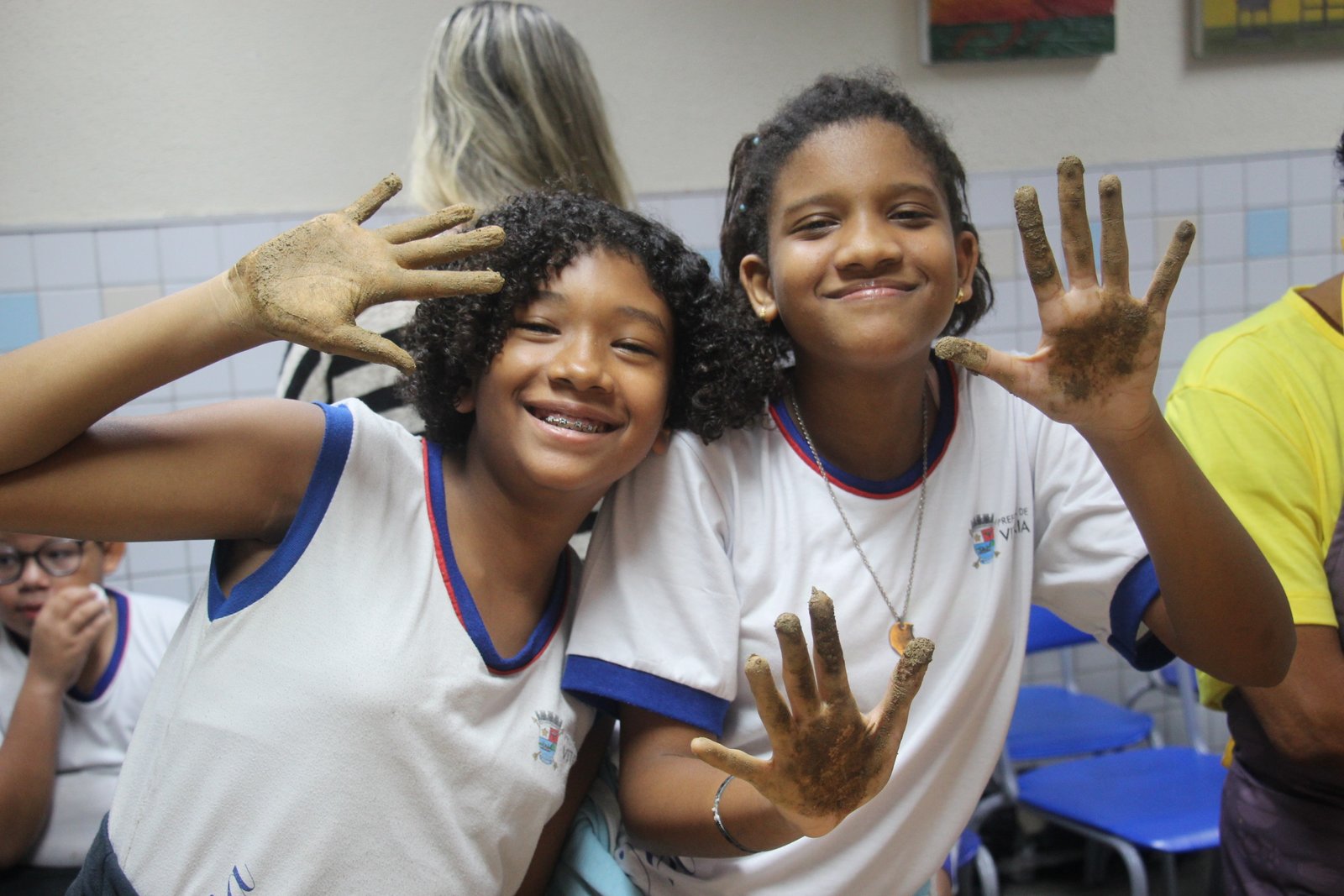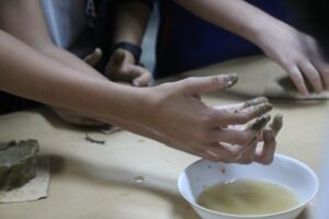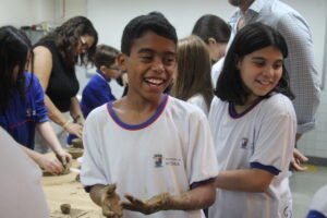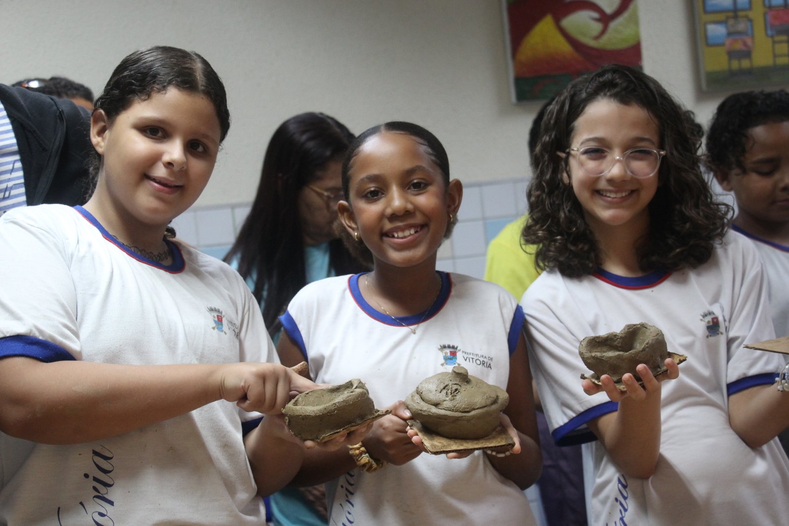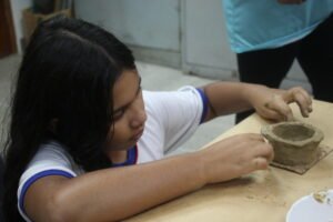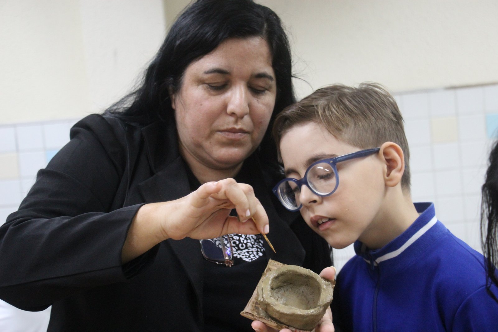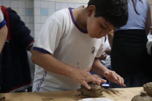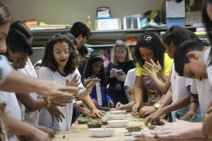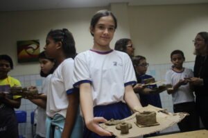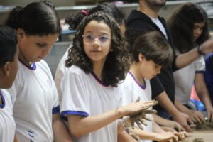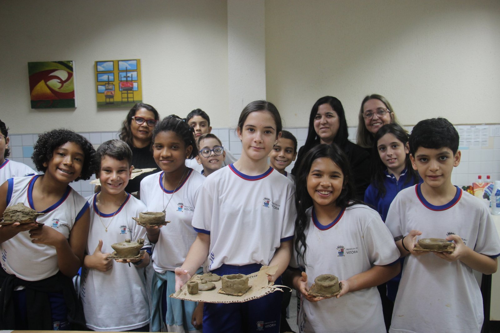 Foi assim, cantarolando a música das paneleiras, que o terceiro ano da EMEF Álvaro de Castro Mattos modelou suas panelinhas durante a terceira oficina do projeto Memória do Barro – Paneleiras, hoje (26/06) pela manhã. Quem comandou a turma foram as paneleiras Rosineia Alvarenga Siqueira, a Rosi (@rosineaalvarengade ), Lucineia de Jesus, a Neia (@paneladebarrodaneia ), e Berenicia Correa Nascimento (@berenicia8 ). O grupo teve a companhia de alguns professores da escola, que vieram dar uma espiadinha.