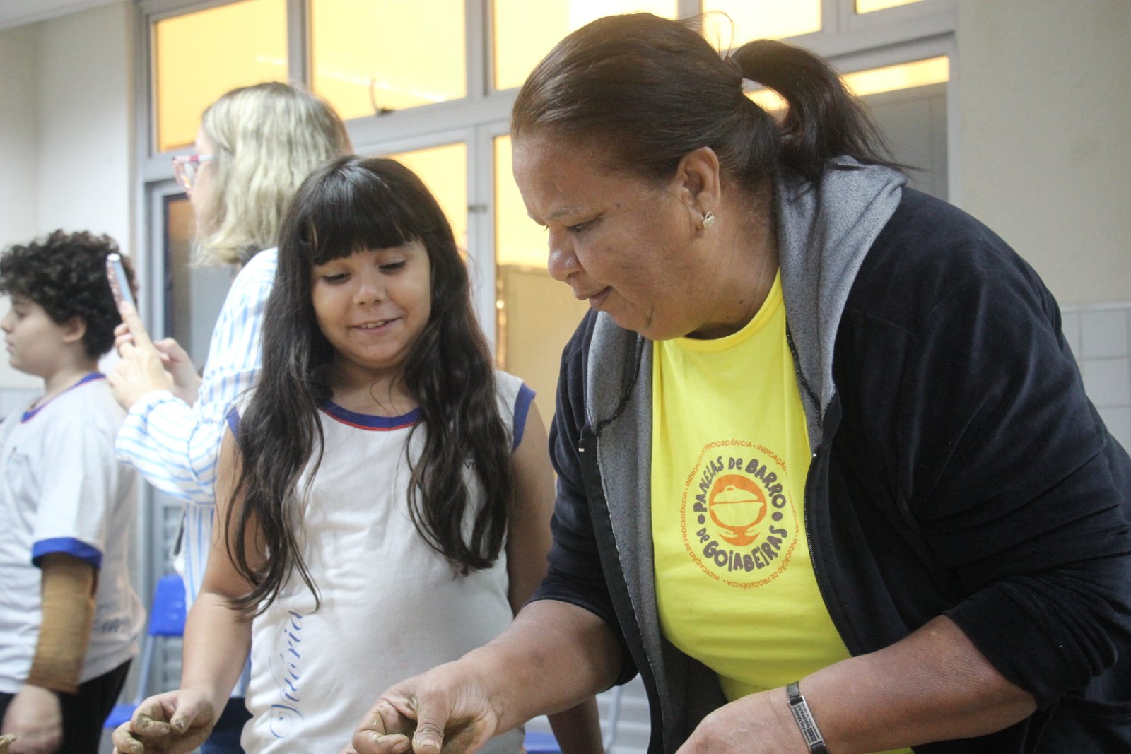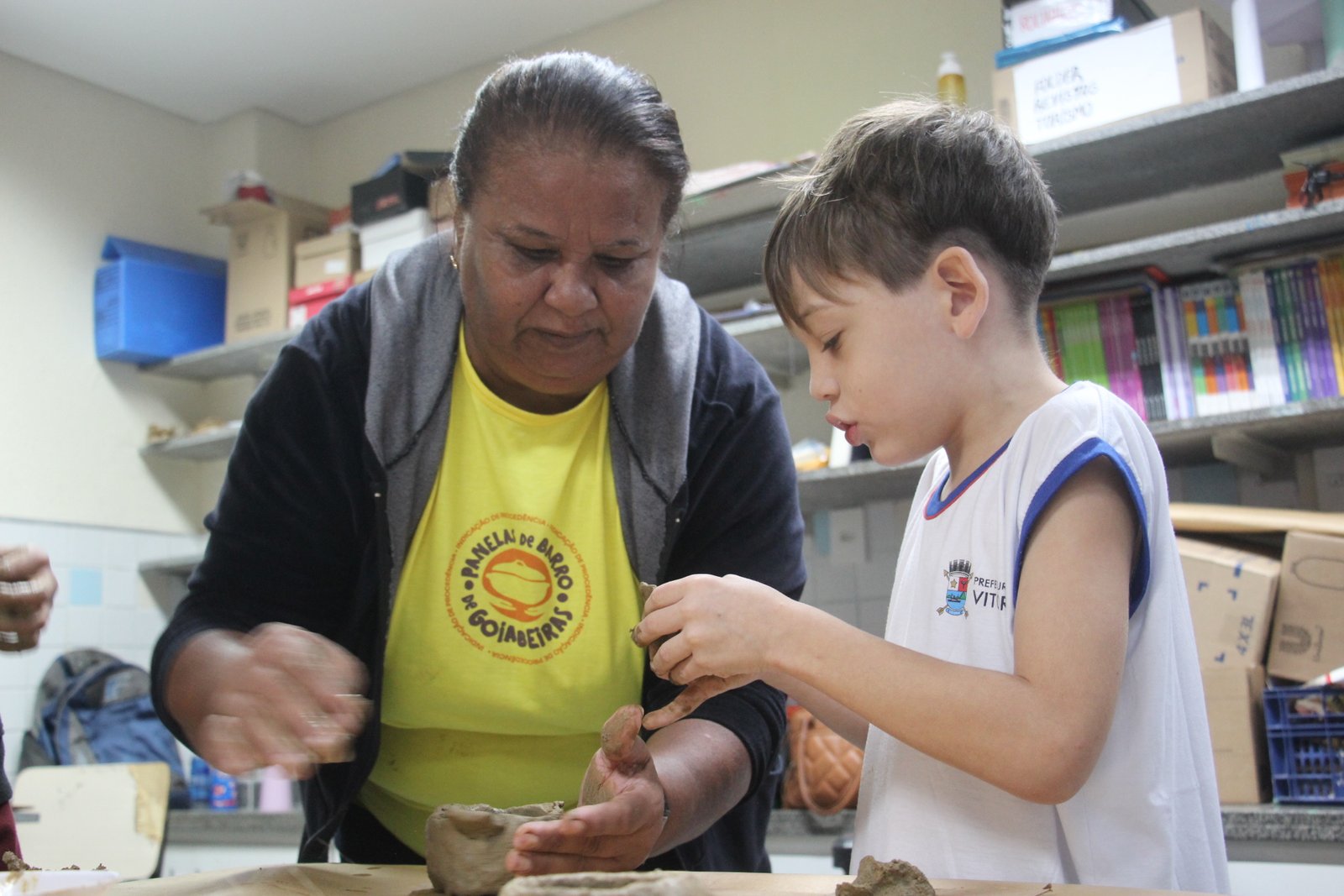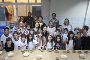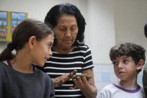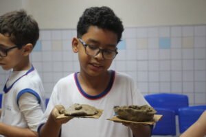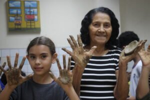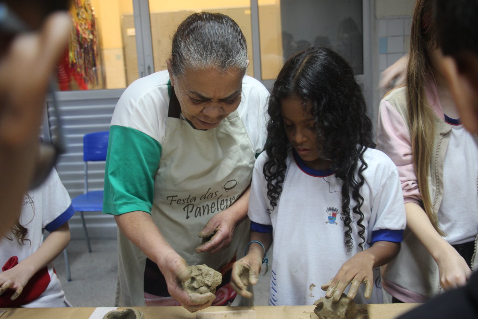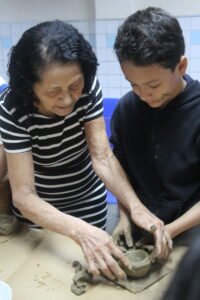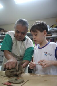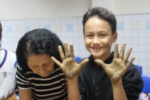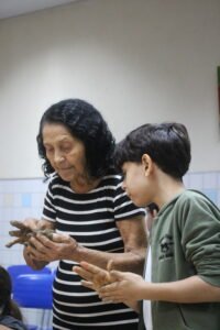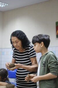 O quinto encontro na escola encerra o ciclo de junho das oficinas do Memória do Barro – Paneleiras. Quem comandou a turma, hoje (27/06), foram as paneleiras Lucy Barbosa Salles e Valdinea Lucidato, que trabalham no galpão da Associação e a griô Sônia Ribeiro, paneleira de quintal e personagem da série Griôs de Goiabeiras, do Instituto Marlin Azul.