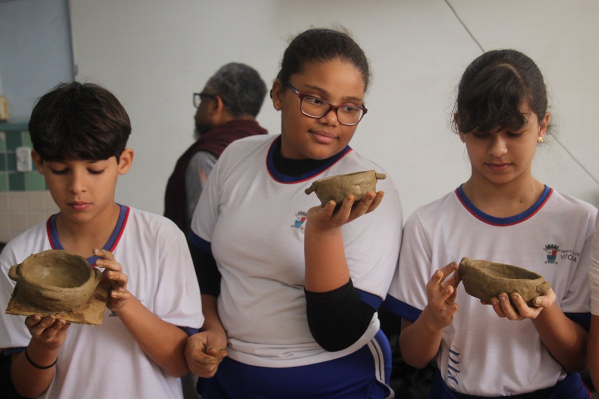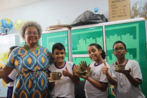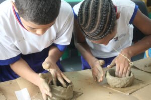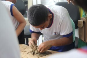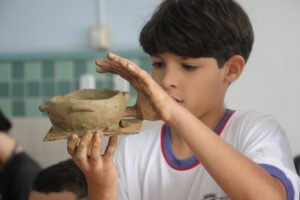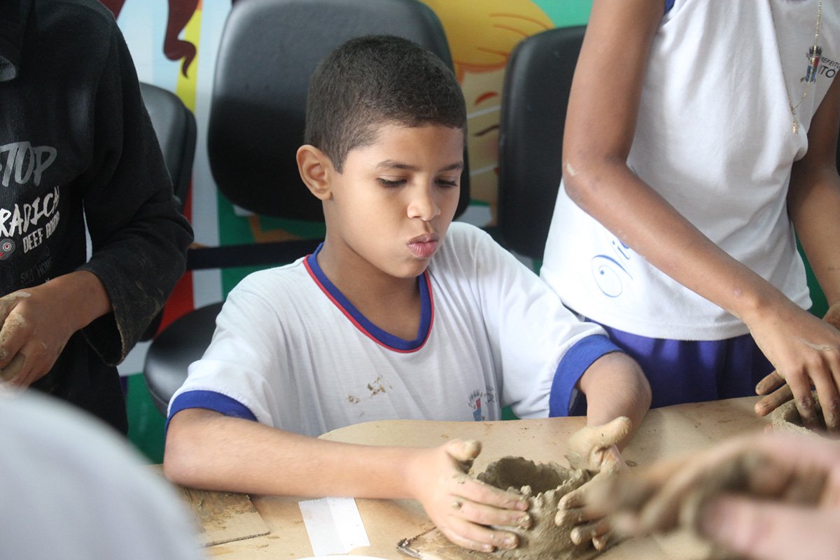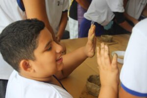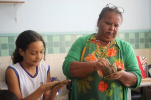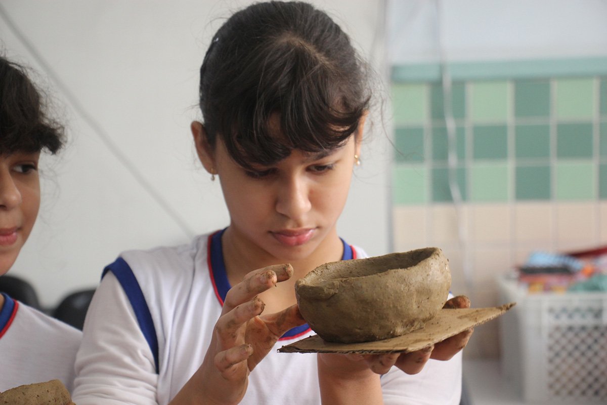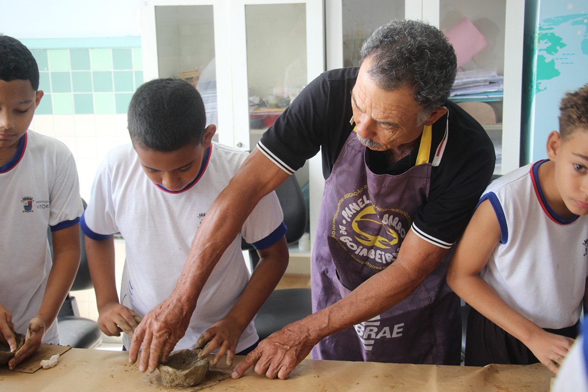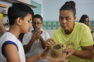 Foi o que ouvimos de um aluno do 5° ano fundamental da EMEF Ceciliano Abel de Almeida, no início do segundo ciclo das oficinas do projeto Memória do Barro – Paneleiras, na EMEF Ceciliano Abel de Almeida. O grupo formado por cerca de 30 pessoas, incluindo 3 professores foi comandado pelas paneleiras Eronildes Correa de Menezes, Jamilda Bento, Valdinea da Victoria Lucidato e o artesão José Carlos Correa Fernandes.