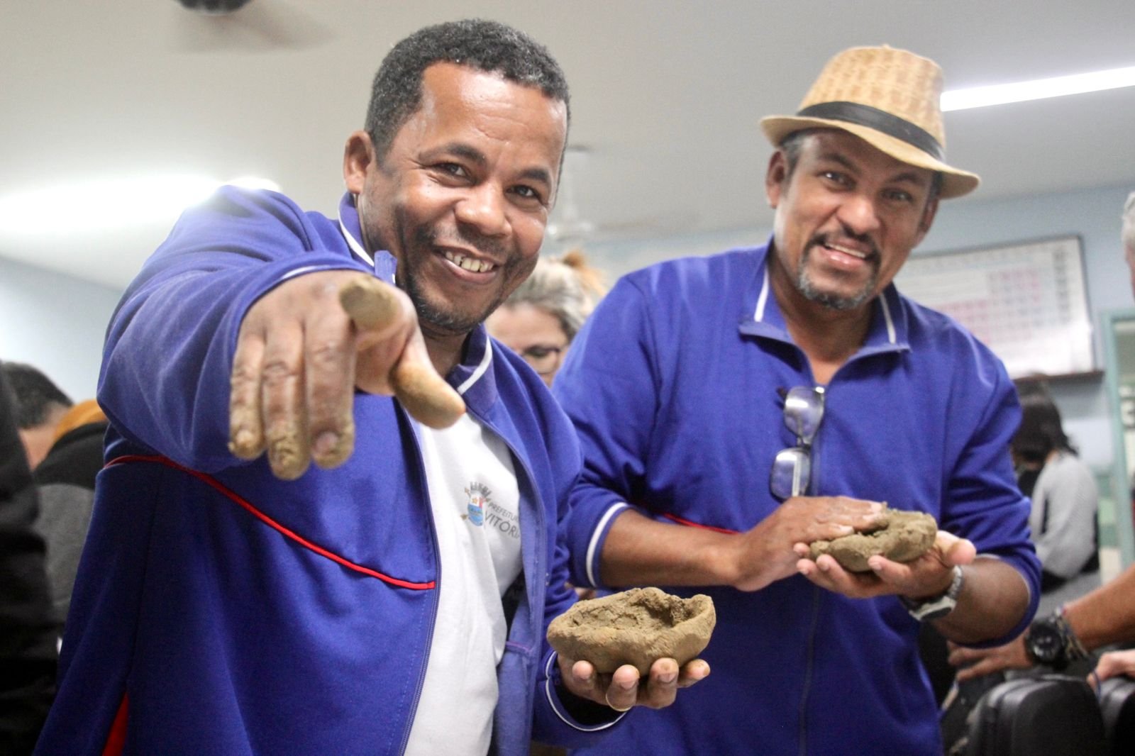 Cerca de 40 pessoas da Educação de Jovens e Adultos (EJA), da EMEF Ceciliano Abel de Almeida, lotaram a sala esta noite. Quem comandou a turma foram as paneleiras Jecilene C. Fernandes, Berenicia Correa Nascimento e o artesão Ronaldo Alves Correa, que também é quem retira o barro do Vale do Mulembá para a maioria