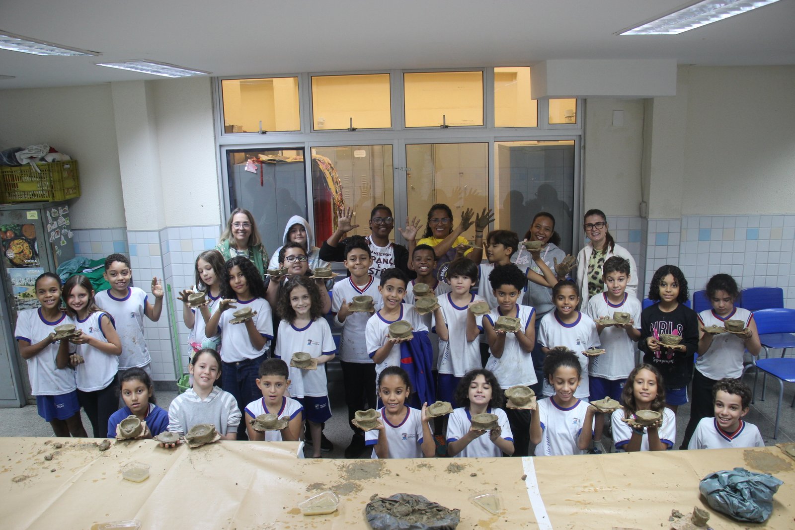 “Eu soooou da panela de barro, eu sou. Eu soooou da panela de barro…” Foi assim, cantarolando a música das paneleiras, que o terceiro ano da EMEF Álvaro de Castro Mattos modelou suas panelinhas durante a terceira oficina do projeto Memória do Barro – Paneleiras, hoje (26/06) pela manhã. Quem comandou a turma foram as